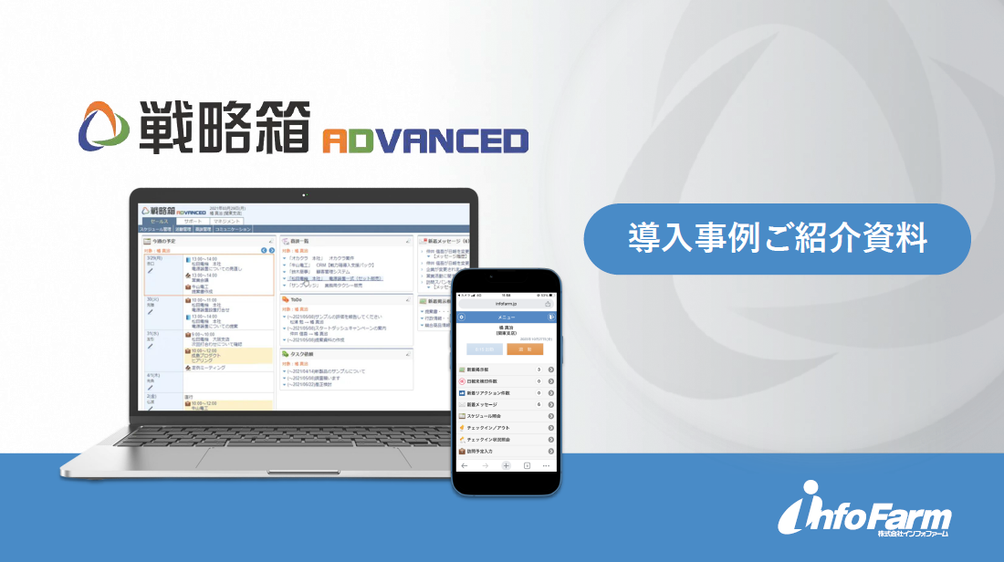 事例集ダウンロードサポート充実で現場に優しい営業支援システム戦略箱ADVANCEDは、25年以上の歴史を持つ国産SFAです。 柔軟なカスタマイズによりさまざまな業種・業態にも対応します。導入事例集をご希望の場合は、本ページよりお問い合わせください。